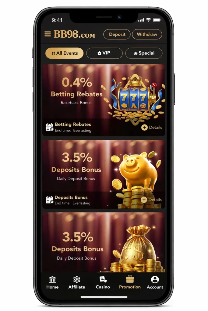 BB98 Game provides number of exciting bonuses and rewards. Users can easily claim different type of huge bonuses and rewards on this application, daily, weekly and as well frequent rewards can be collected on this application.