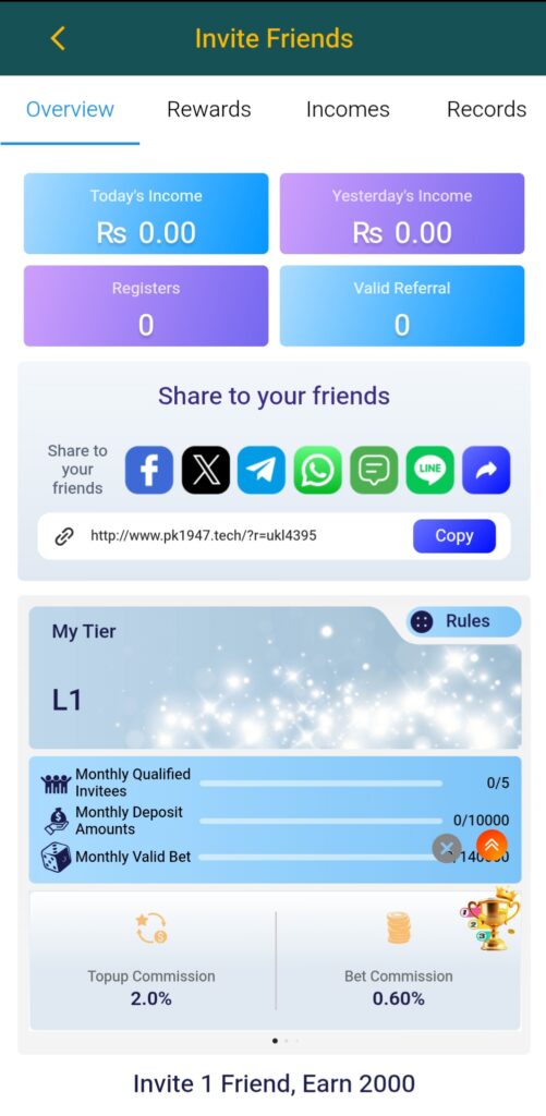 If a player invites a new user, then collect the referral Bonus and also get Lum sum commission daily. Log in every day to get more rewards.